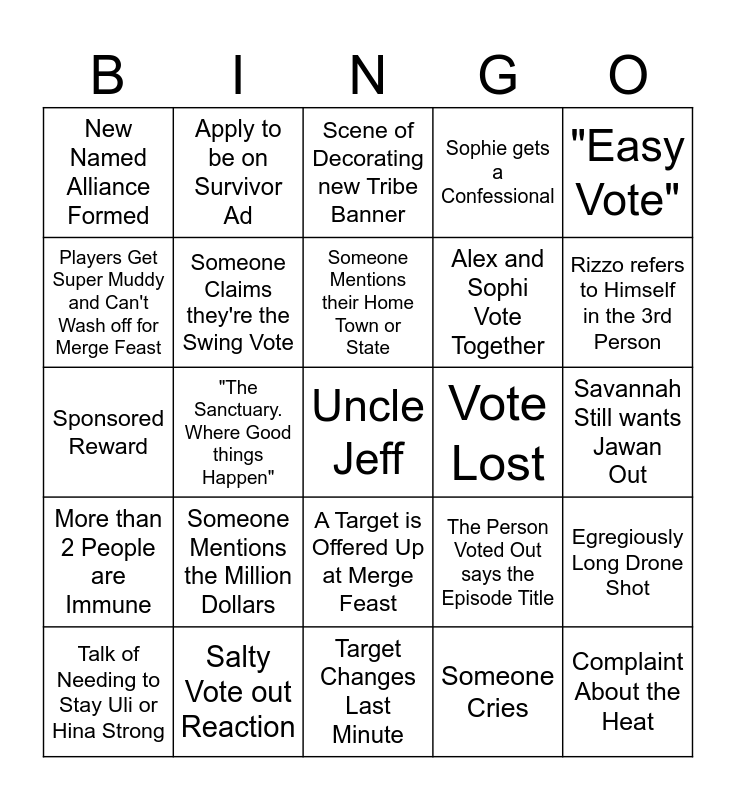 This bingo card has a free space and 29 words: Talk of Needing to Stay Uli or Hina Strong, Push for an all Girls or Guys Voting Block, "The Sanctuary. Where Good things Happen", Live Tribal, New Named Alliance Formed, Scene of Decorating new Tribe Banner, Someone Claims they're the Swing Vote, Someone Mentions the Million Dollars, Vote Lost, Salty Vote out Reaction, Savannah Still wants Jawan Out, Complaint About the Heat, Target Changes Last Minute, Someone Cries, Rizzo refers to Himself in the 3rd Person, A Woman Gets the Advantage in the Scramble, A Target is Offered Up at Merge Feast, More than 2 People are Immune, "Easy Vote", Sponsored Reward, The Person Voted Out says the Episode Title, Push for a Vote Split, Alex and Sophi Vote Together, Players Get Super Muddy and Can't Wash off for Merge Feast, Sophie gets a Confessional, Apply to be on Survivor Ad, Egregiously Long Drone Shot, Someone Mentions their Home Town or State and SiTD, Idol, or Advantage Played.