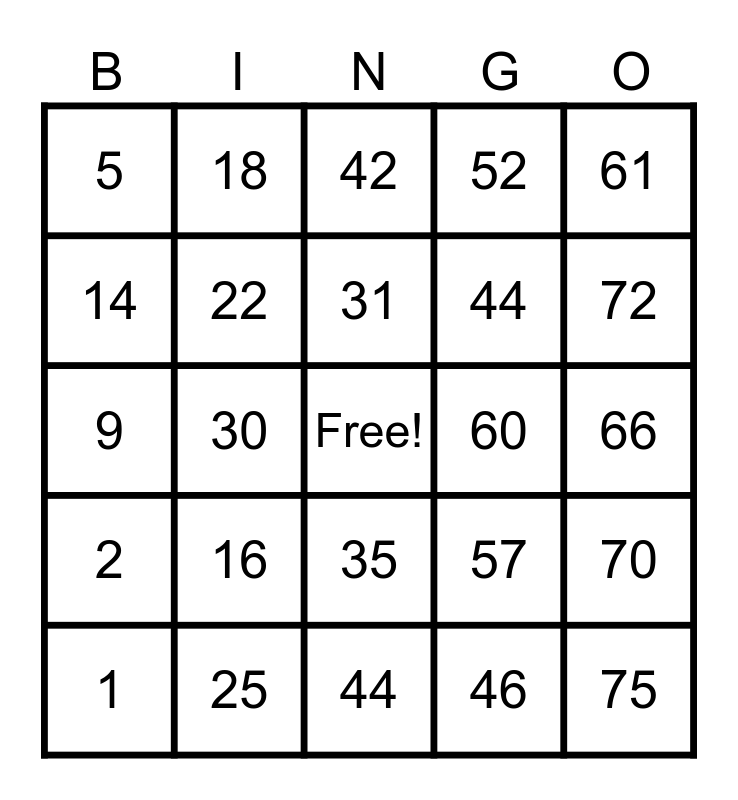 This bingo card has a free space and 24 words: 1, 16, 31, 46, 61, 5, 18, 42, 60, 66, 9, 22, 57, 70, 14, 25, 44, 52, 72, 2, 30, 35, 44 and 75.