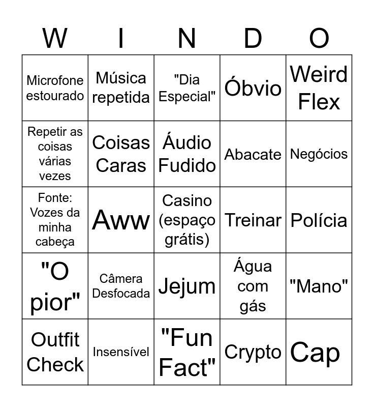This bingo card has a free space and 24 words: Outfit Check, Câmera Desfocada, Áudio Fudido, Crypto, Weird Flex, Microfone estourado, Música repetida, "Dia Especial", Treinar, Polícia, Fonte: Vozes da minha cabeça, Coisas Caras, Água com gás, "Mano", Repetir as coisas várias vezes, Insensível, "Fun Fact", Óbvio, Negócios, "O pior", Aww, Jejum, Abacate and Cap.