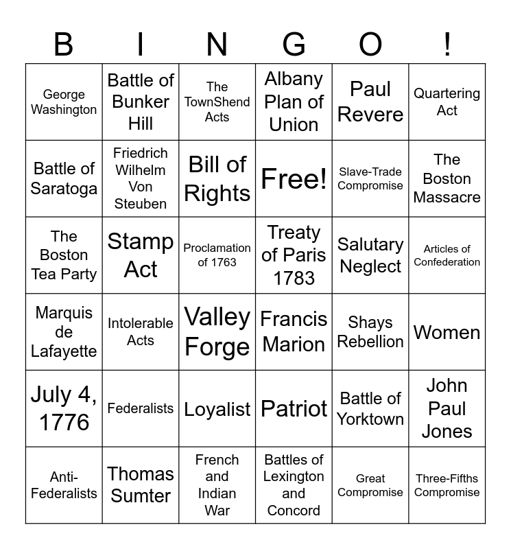 This bingo card has 36 words: Patriot, Loyalist, Battles of Lexington and Concord, Battle of Saratoga, Marquis de Lafayette, Treaty of Paris 1783, Friedrich Wilhelm Von Steuben, French and Indian War, Paul Revere, Battle of Yorktown, The Boston Massacre, Albany Plan of Union, John Paul Jones, Stamp Act, Free!, George Washington, July 4, 1776, Salutary Neglect, The Boston Tea Party, The TownShend Acts, Proclamation of 1763, Intolerable Acts, Francis Marion, Valley Forge, Shays Rebellion, Battle of Bunker Hill, Slave-Trade Compromise, Thomas Sumter, Bill of Rights, Quartering Act, Three-Fifths Compromise, Anti-Federalists, Women, Articles of Confederation, Federalists and Great Compromise.