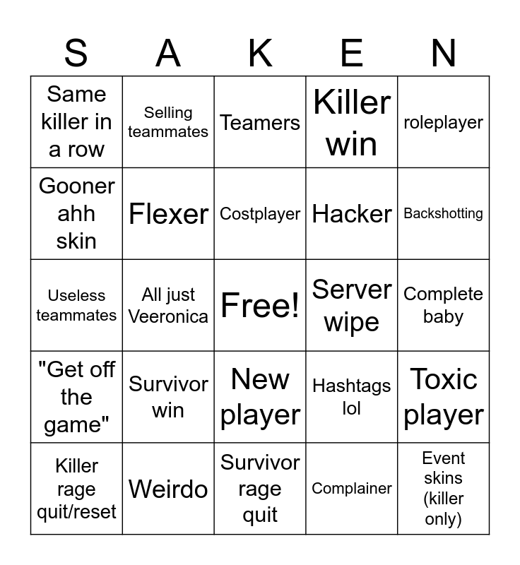 This bingo card has a free space and 24 words: Killer rage quit/reset, Survivor win, Costplayer, Complainer, roleplayer, Same killer in a row, Selling teammates, Teamers, Server wipe, Complete baby, Useless teammates, Flexer, Hashtags lol, Toxic player, Gooner ahh skin, Weirdo, Survivor rage quit, Killer win, Backshotting, "Get off the game", All just Veeronica, New player, Hacker and Event skins (killer only).