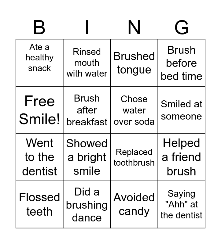This bingo card has 16 words: Did a brushing dance, Helped a friend brush, Brushed tongue, Ate a healthy snack, Went to the dentist, Rinsed mouth with water, Replaced toothbrush, Avoided candy, Free Smile!, Brush after breakfast, Flossed teeth, Brush before bed time, Showed a bright smile, Smiled at someone, Chose water over soda and Saying "Ahh" at the dentist.
