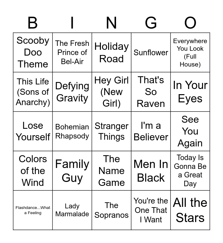 This bingo card has 33 words: All the Stars, Big Bang Theory, Bohemian Rhapsody, Cheers Theme, Colors of the Wind, Defying Gravity, Everywhere You Look (Full House), Flashdance...What a Feeling, The Fresh Prince of Bel-Air, Hakuna Matata, Hey Girl (New Girl), Holiday Road, I Don't Want to Be, I Want You to Want Me, I'm a Believer, In Your Eyes, Lady Marmalade, Lose Yourself, Family Guy, Men In Black, The Name Game, Part of Your World, Scooby Doo Theme, See You Again, The Sopranos, Stranger Things, Sunflower, That's So Raven, This Life (Sons of Anarchy), Today Is Gonna Be a Great Day, The X Files, You're the One That I Want and 9 to 5.