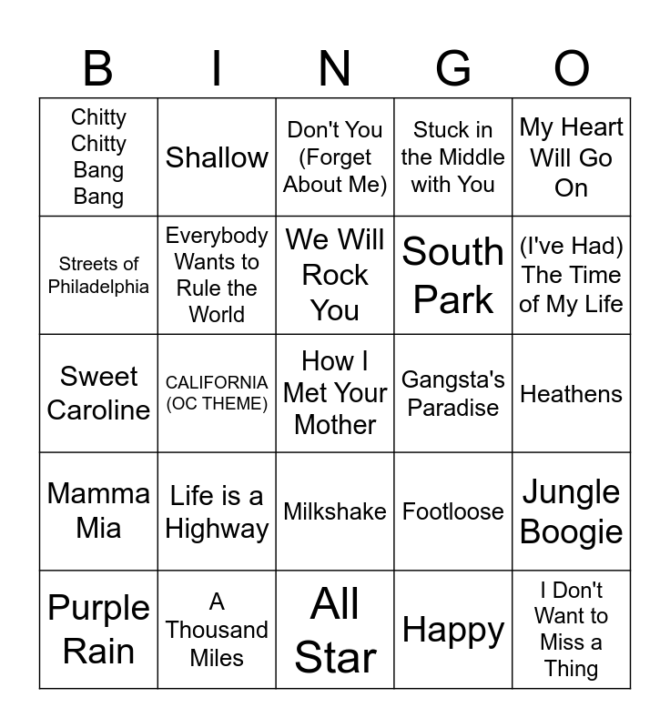 This bingo card has 31 words: All Star, Bitter Sweet Symphony, CALIFORNIA (OC THEME), CAN'T STOP THE FEELING!, Chitty Chitty Bang Bang, Don't You (Forget About Me), Everybody Wants to Rule the World, Footloose, Gangsta's Paradise, Happy, Heathens, How I Met Your Mother, I Don't Want to Miss a Thing, I Will Always Love You, (I've Had) The Time of My Life, Immortals, Jungle Boogie, Life is a Highway, Mamma Mia, Milkshake, My Heart Will Go On, The Power of Love, Purple Rain, Shallow, South Park, Streets of Philadelphia, Stuck in the Middle with You, Sweet Caroline, A Thousand Miles, We Will Rock You and You Got a Friend In Me.