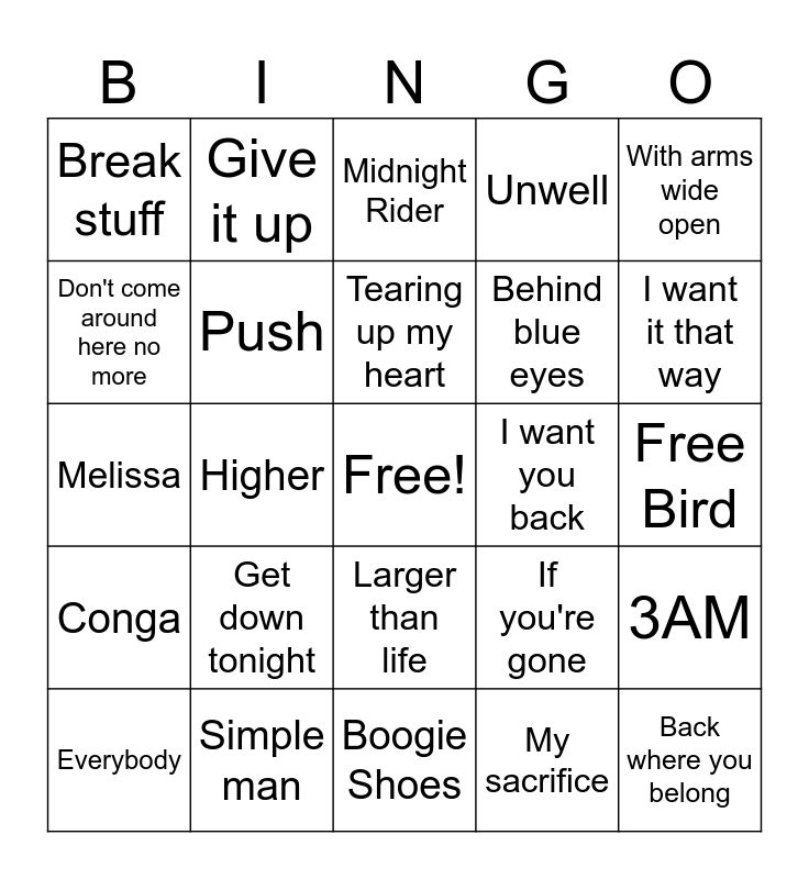 This bingo card has a free space and 46 words: Caught up on you, Back where you belong, Fortunate son, Boogie Shoes, Get down tonight, That's the way (I like it), Give it up, I won't back down, Don't come around here no more, American Girl, Push, Unwell, 3AM, If you're gone, Ocean Avenue, It's gonna be me, Tearing up my heart, I want you back, Bye Bye Bye, With arms wide open, Higher, My sacrifice, Break stuff, Behind blue eyes, Take a look around, I want it that way, Everybody, Shape of my heart, Larger than life, Conga, Rhythm is gonna get you, Turn the beat around, Whatcha say, Trumpets, Ridin solo, Simple man, Free Bird, Sweet Home Alabama, Gimme three steps, Call me the breeze, Ramblin man, Midnight Rider, Melissa, Barefoot blue jean night, Anywhere with you and Eight second ride.