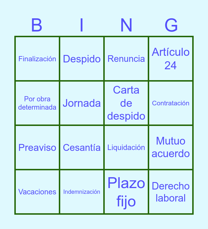 This bingo card has 28 words: Free!, Contrato, Plazo fijo, Tiempo indefinido, Por obra determinada, Despido, Renuncia, Mutuo acuerdo, Preaviso, Indemnización, Artículo 18, Artículo 24, Artículo 26, Patrono, Trabajador, Salario, Código de Trabajo, Jornada, Liquidación, Derecho laboral, Finalización, Causa justa, Terminación, Contratación, Vacaciones, Cesantía, Carta de despido and Evaluación.