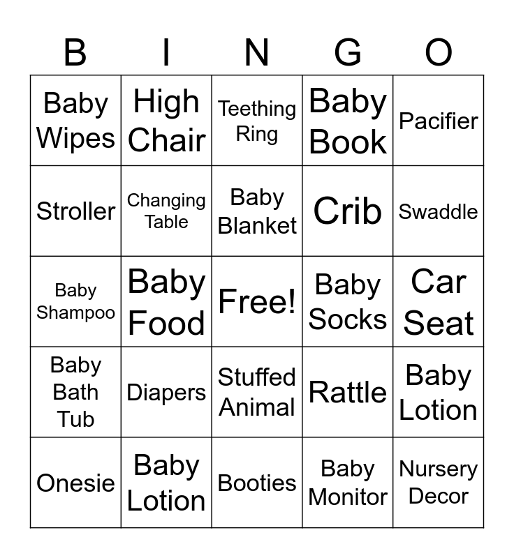 This bingo card has a free space and 24 words: Diapers, Baby Lotion, Baby Blanket, Onesie, Pacifier, Baby Wipes, Stroller, High Chair, Baby Socks, Stuffed Animal, Crib, Baby Shampoo, Rattle, Baby Lotion, Changing Table, Baby Monitor, Car Seat, Teething Ring, Swaddle, Baby Food, Nursery Decor, Baby Bath Tub, Baby Book and Booties.