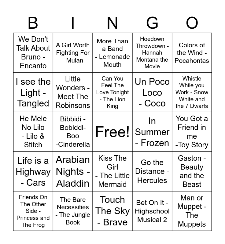 This bingo card has a free space and 24 words: Arabian Nights - Aladdin, The Bare Necessities - The Jungle Book, Can You Feel The Love Tonight - The Lion King, Friends On The Other Side - Princess and The Frog, Colors of the Wind - Pocahontas, We Don't Talk About Bruno - Encanto, I see the Light - Tangled, A Girl Worth Fighting For - Mulan, In Summer - Frozen, Kiss The Girl - The Little Mermaid, Un Poco Loco - Coco, He Mele No Lilo - Lilo & Stitch, Go the Distance - Hercules, Gaston - Beauty and the Beast, Little Wonders - Meet The Robinsons, Bet On It - Highschool Musical 2, You Got a Friend in me -Toy Story, More Than a Band - Lemonade Mouth, Whistle While you Work - Snow White and the 7 Dwarfs, Bibbidi -Bobiddi-Boo -Cinderella, Man or Muppet - The Muppets, Life is a Highway - Cars, Hoedown Throwdown - Hannah Montana the Movie and Touch The Sky - Brave.