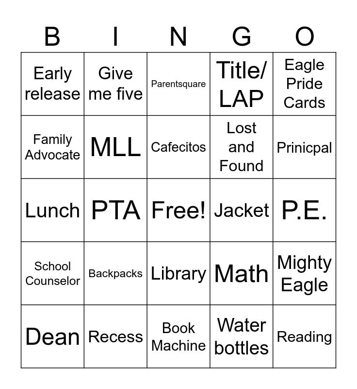 This bingo card has a free space and 25 words: Backpacks, Book Machine, Cafecitos, Dean, Eagle Pride Cards, Early release, Family Advocate, Give me five, Jacket, Library, Lost and Found, Lunch, Math, Mighty Eagle, MLL, Music, P.E., Parentsquare, Prinicpal, PTA, Reading, Recess, School Counselor, Title/ LAP and Water bottles.