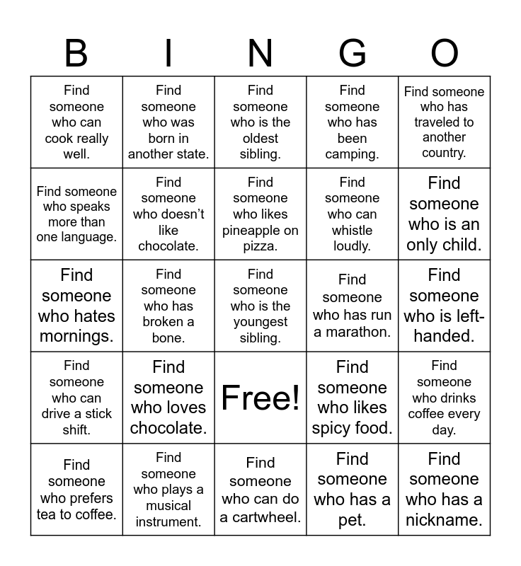 This bingo card has 26 words: Free!, Find someone who has a pet., Find someone who likes pineapple on pizza., Find someone who plays a musical instrument., Find someone who has traveled to another country., Find someone who can cook really well., Find someone who speaks more than one language., Find someone who was born in another state., Find someone who is left-handed., Find someone who likes spicy food., Find someone who can whistle loudly., Find someone who hates mornings., Find someone who drinks coffee every day., Find someone who prefers tea to coffee., Find someone who has broken a bone., Find someone who has a tattoo., Find someone who has been camping., Find someone who can drive a stick shift., Find someone who is the oldest sibling., Find someone who is the youngest sibling., Find someone who is an only child., Find someone who can do a cartwheel., Find someone who has run a marathon., Find someone who loves chocolate., Find someone who doesn’t like chocolate. and Find someone who has a nickname..