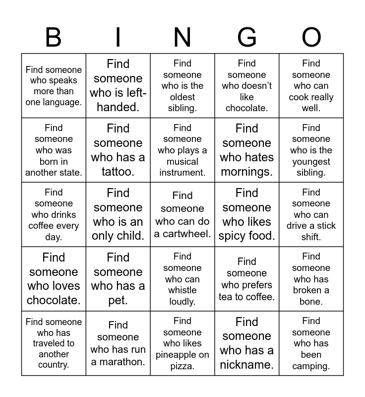 This bingo card has 25 words: Find someone who has a pet., Find someone who likes pineapple on pizza., Find someone who plays a musical instrument., Find someone who has traveled to another country., Find someone who can cook really well., Find someone who speaks more than one language., Find someone who was born in another state., Find someone who is left-handed., Find someone who likes spicy food., Find someone who can whistle loudly., Find someone who hates mornings., Find someone who drinks coffee every day., Find someone who prefers tea to coffee., Find someone who has broken a bone., Find someone who has a tattoo., Find someone who has been camping., Find someone who can drive a stick shift., Find someone who is the oldest sibling., Find someone who is the youngest sibling., Find someone who is an only child., Find someone who can do a cartwheel., Find someone who has run a marathon., Find someone who loves chocolate., Find someone who doesn’t like chocolate. and Find someone who has a nickname..