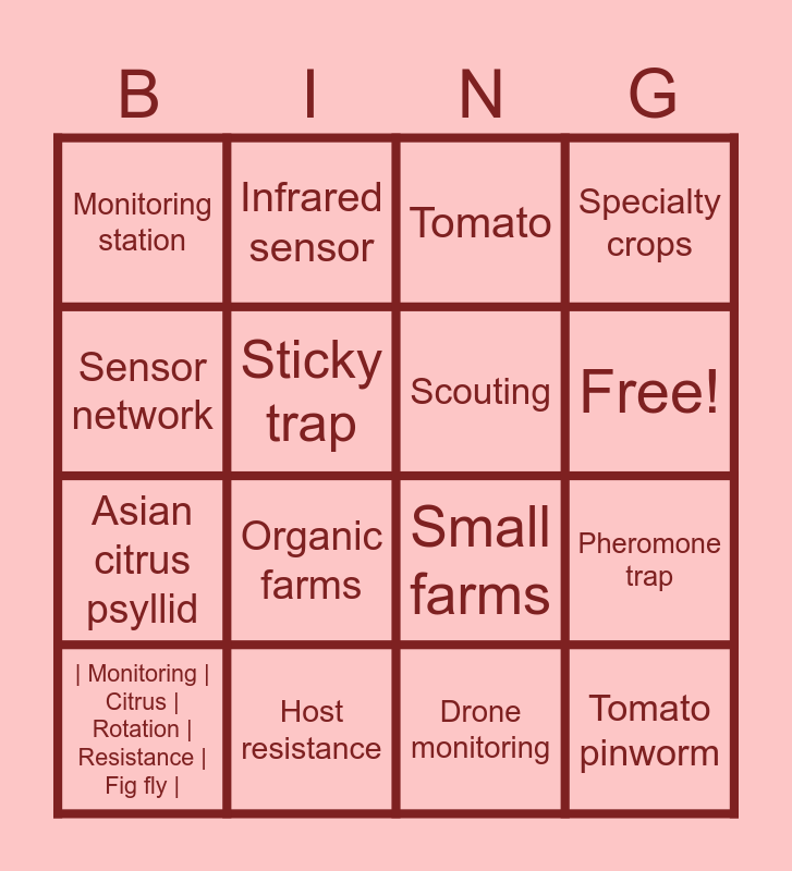 This bingo card has 68 words: | Hydrogels | Biocontrol | Thrips | Pheromone | Nanoparticles |, | Monitoring | Citrus | Rotation | Resistance | Fig fly |, | Ants | Organic | IPM plan | Parasitoids | Beetle |, | Whiteflies | Trap | Natural enemies | Tomato pinworm | Sustainable |, | Growers | IR Sensor | Small farms | Tree nuts | Essential oils |, Hydrogels, Infrared sensor, Smart trap, Free!, Pheromone lure, Nanoparticles, Essential oils, Drone monitoring, Sensor network, Data logger, Sticky trap, Pheromone trap, Monitoring station, Thrips, Mealybug, Asian citrus psyllid, Whitefly, Tomato pinworm, Black fig fly, Beetle, Invasive ants, Citrus mealybug, Lebbeck mealybug, Truncatus beetle, Pinworm larva, Tomato, Figs, Tree nuts, Almonds, Specialty crops, High tunnels, Greenhouse, Orchard, Organic farms, Small farms, Blueberries, Monitoring, Scouting, Threshold, Action level, Cultural control, Biological control, Chemical control, Host resistance, Pesticide rotation, Resistance management, Natural enemies, Parasitoids, Predators, Trap cropping, Push-pull strategy, Augmentative release, Integrated management, IPM plan, Sustainable solutions, Ecological balance, Extension outreach, Adoption, Collaboration, Growers, Training, Early detection and Sampling.