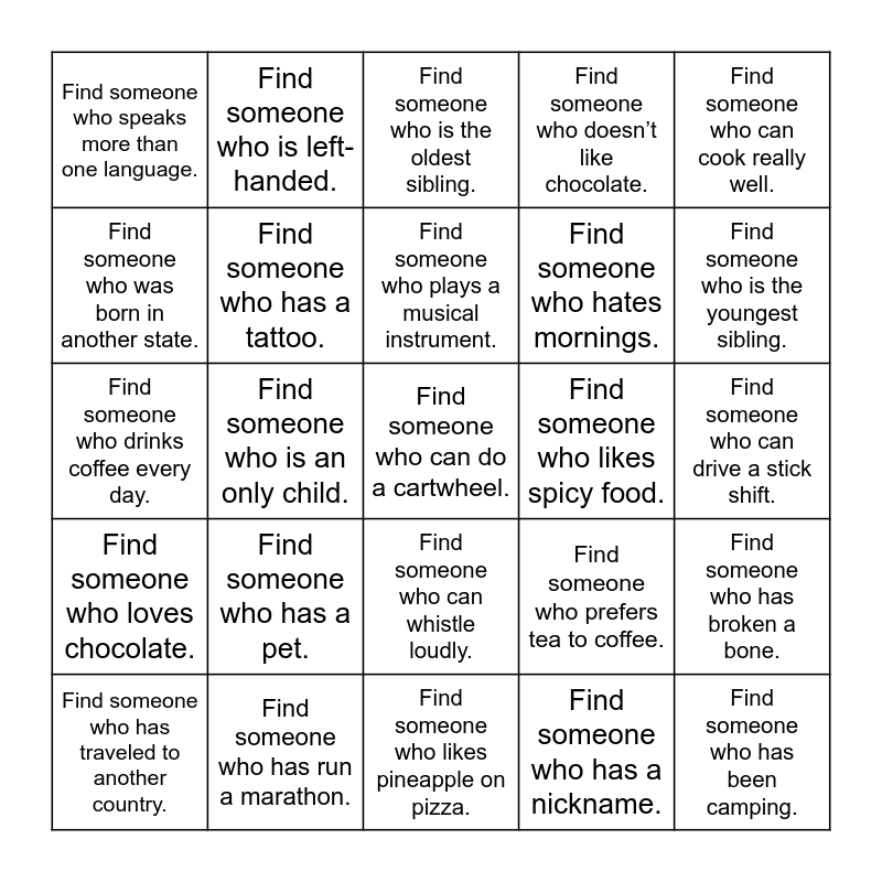 This bingo card has 25 words: Find someone who has a pet., Find someone who likes pineapple on pizza., Find someone who plays a musical instrument., Find someone who has traveled to another country., Find someone who can cook really well., Find someone who speaks more than one language., Find someone who was born in another state., Find someone who is left-handed., Find someone who likes spicy food., Find someone who can whistle loudly., Find someone who hates mornings., Find someone who drinks coffee every day., Find someone who prefers tea to coffee., Find someone who has broken a bone., Find someone who has a tattoo., Find someone who has been camping., Find someone who can drive a stick shift., Find someone who is the oldest sibling., Find someone who is the youngest sibling., Find someone who is an only child., Find someone who can do a cartwheel., Find someone who has run a marathon., Find someone who loves chocolate., Find someone who doesn’t like chocolate. and Find someone who has a nickname..