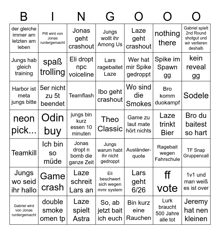 This bingo card has a free space and 48 words: Teamkill, Odin buy, Laze spielt Astra, Jungs warum habt ihr nicht gedroppt, Wer hat mir Spike gedroppt, Laze trinkt Bier, Gabriel spielt 2nd Round shotgut und wir verlieren deshalb, Gabriel wird von Jonas runtergemacht, 5er nicht zu 5t beendet, jungs bin kurz essen 10 minuten, Jungs wollt ihr Among Us, Laze geht crashout, Bro komm duokampf, Sodele, neon pick..., Game crash, Jonas geht crashout, Ibo geht crashout, Lars geht 6/26, nothing there, kein reveal gg, Jungs hab gleich training, Pitt wird von Jonas runtergemacht, Eli dropt npc voiceline, Bin kurz eine Rauchen, Spike im Spawn gg, Bro du baitest so hart, Jungs wo seid ihr hallo, Ich bin so müde, Teamflash, Eli beschwert sich wegen mmr system, Wo sind die Smokes, ff vote, 1v1 und man weiß es ist over, der gleiche immer am letzten am leben, double smoke omen tp, Jonas dropt n bomb die ganze Zeit, So, ab jetzt bait ich euch, Game zu laut mate hört nichts, Lurk braucht 500 Jahre alle tot, TF Snap Gruppencall, Harbor ist meta jungs bitte, spaß trolling, Laze schreit Lars an, Lars ragebaitet Laze, Ausländer- quote, Ragebait wegen Fahrschule and Jeremy hat nen kleinen.