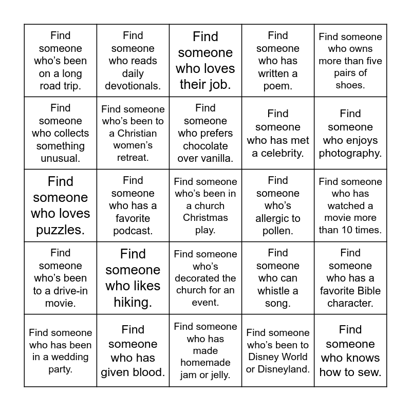 This bingo card has 200 words: Find someone who has taken a cooking class., Find someone who has traveled outside the country., Find someone who’s afraid of spiders., Find someone who can play a musical instrument., Find someone who owns a plant they’ve kept alive for over a year., Find someone who prefers tea over coffee., Find someone who has run a marathon or race., Find someone who’s been on a cruise., Find someone who likes pineapple on pizza., Find someone who has met a celebrity., Find someone who enjoys reading mystery novels., Find someone who loves thunderstorms., Find someone who’s been skydiving or bungee jumping., Find someone who has broken a bone., Find someone who collects mugs or magnets., Find someone who’s the oldest child in their family., Find someone who has volunteered recently., Find someone who knows CPR., Find someone who has a hidden talent., Find someone who has gone camping., Find someone who can speak more than one language., Find someone who has ever been on TV or in a newspaper., Find someone who has a tattoo., Find someone who prefers cats over dogs., Find someone who has given blood., Find someone who loves spicy food., Find someone who’s lived in more than three states., Find someone who has binge-watched a TV series., Find someone who can whistle a song., Find someone who has made homemade bread., Find someone who prefers beach vacations., Find someone who has been in a wedding party., Find someone who’s afraid of heights., Find someone who has sung karaoke., Find someone who has been to a professional sports game., Find someone who drinks their coffee black., Find someone who has been to a concert in the past year., Find someone who loves to dance., Find someone who enjoys gardening., Find someone who has taken care of a pet fish., Find someone who’s a night owl., Find someone who wakes up before 6 a.m. regularly., Find someone who’s never seen snow., Find someone who has donated to charity this year., Find someone who loves to cook., Find someone who’s allergic to cats., Find someone who’s run out of gas before., Find someone who has seen a shooting star., Find someone who plays a sport., Find someone who has gone fishing., Find someone who owns more than five pairs of shoes., Find someone who has written a poem., Find someone who loves puzzles., Find someone who’s been to a drive-in movie., Find someone who has read the same book more than three times., Find someone who’s been to Disney World or Disneyland., Find someone who owns a pet., Find someone who’s afraid of snakes., Find someone who can bake cookies from scratch., Find someone who has been on an airplane this year., Find someone who loves Christmas music year-round., Find someone who’s taken ballroom dance lessons., Find someone who’s been in a talent show., Find someone who can drive a stick shift., Find someone who prefers winter to summer., Find someone who loves watching documentaries., Find someone who can juggle., Find someone who’s met someone famous., Find someone who has a favorite Bible verse., Find someone who loves singing in the car., Find someone who plays board games regularly., Find someone who has gone scuba diving or snorkeling., Find someone who collects something unusual., Find someone who enjoys painting., Find someone who has a green thumb., Find someone who loves going to thrift stores., Find someone who has made homemade jam or jelly., Find someone who has been to another continent., Find someone who has been in a parade., Find someone who owns a record player., Find someone who’s been on a long road trip., Find someone who knows how to knit or crochet., Find someone who loves dogs., Find someone who can name all 50 states., Find someone who has tried surfing., Find someone who prefers chocolate over vanilla., Find someone who’s been on a mission trip., Find someone who drinks tea daily., Find someone who has seen a sunrise this month., Find someone who loves coffee shops., Find someone who’s gone horseback riding., Find someone who owns more than one Bible., Find someone who can name three constellations., Find someone who has prayed with a friend recently., Find someone who has a favorite podcast., Find someone who loves crafting., Find someone who likes hiking., Find someone who has gone to a retreat before., Find someone who’s afraid of public speaking., Find someone who’s read through the entire Bible., Find someone who has worked in customer service., Find someone who enjoys spicy food., Find someone who’s been to a baby shower this year., Find someone who prefers texting to calling., Find someone who can do a handstand., Find someone who has watched a movie more than 10 times., Find someone who loves picnics., Find someone who has a birthday this month., Find someone who loves their job., Find someone who can quote a movie line perfectly., Find someone who enjoys crossword puzzles., Find someone who can play chess., Find someone who has taught a class., Find someone who has made a YouTube video., Find someone who has attended a women’s conference., Find someone who prays every morning., Find someone who’s been to a live theater show., Find someone who knows how to sew., Find someone who loves a clean house., Find someone who sings in a choir., Find someone who loves history., Find someone who can bake a cake from scratch., Find someone who likes country music., Find someone who’s never broken a bone., Find someone who’s allergic to pollen., Find someone who has done a 5K., Find someone who’s tried yoga., Find someone who’s seen a double rainbow., Find someone who likes watching sports., Find someone who’s worked in healthcare., Find someone who has more than three siblings., Find someone who prefers rain over sunshine., Find someone who can cook without using a recipe., Find someone who has hosted Thanksgiving dinner., Find someone who can roll their tongue., Find someone who loves camping., Find some