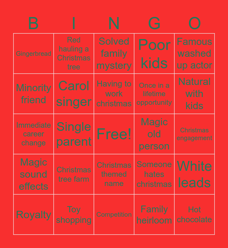 This bingo card has a free space and 49 words: Dead parents, Hot chocolate, Baking, Competition, Christmas tree farm, Snowing, Red hauling a Christmas tree, Sassy friend, Minority friend, Lights turn on, Carol singer, Poor kids, White leads, Someone hates christmas, Decorating tree, Third act misunderstanding, Having to work christmas, Magic old person, Old man/women is santa, Famous washed up actor, Single parent, Family heirloom, Gingerbread, Once in a lifetime opportunity, Actors off wish, Natural with kids, Royalty, Praise outweighs talent, Christmas themed name, Magic sound effects, Family receipe, Red dress, Snowball fight, Reindeer, Toy shopping, Priceless heirloom looks cheap, Mistaken identity, Mistletoe, Christmas engagement, Christmas formal ball, Child matchmaker, Immediate chemistry, Shitty ex, Shitty partner, Immediate career change, Solved family mystery, Kissing while snowing, That's not how it works and Christmas pyjamas.