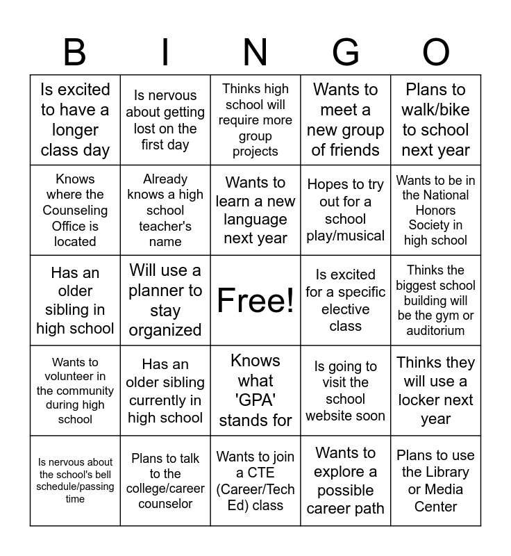 This bingo card has a free space and 49 words: Is excited about a specific club/sport, Plans to use the Library or Media Center, Knows the name of the high school mascot, Wants to join a CTE (Career/Tech Ed) class, Has an older sibling currently in high school, Plans to eat lunch in the cafeteria, Is nervous about getting lost on the first day, Has a question ready for a high school tour, Knows where the Counseling Office is located, Wants to try a new subject (e.g., photography), Already knows a high school teacher's name, Wants to meet a new group of friends, Thinks they will use a locker next year, Is going to visit the school website soon, Wants to earn a specific scholarship, Knows what a 'credit' is in high school, Wants to learn a new language next year, Is excited for a specific elective class, Has identified a mentor (teacher/coach) for next year, Plans to walk/bike to school next year, Will use a planner to stay organized, Wants to explore a possible career path, Is excited to have a longer class day, Hopes to try out for a school play/musical, Plans to get tutoring from an older student, Wants to be in the National Honors Society in high school, Is nervous about the school's bell schedule/passing time, Can name a required class they are looking forward to, Knows what 'GPA' stands for, Wants to volunteer in the community during high school, Knows where the main school office is located, Thinks they might take an online high school course, Is excited to attend their first high school dance, Has saved their future high school's website address, Plans to talk to the college/career counselor, Wants to make friends with someone from another middle school, Knows the difference between a lunch period and study hall, Plans to organize their schedule using a digital tool, Thinks the biggest school building will be the gym or auditorium, Hopes to find a quiet space to de-stress during the day, Is excited that lockers aren't required, Wants to join the student newspaper or yearbook staff, Knows someone at their future high school already, Knows the typical start and end time of the school day, Has an older sibling in high school, Thinks high school will require more group projects, Knows what the high school mascot is, Wants to try out for the musical/play and Hopes to have a job while attending high school.