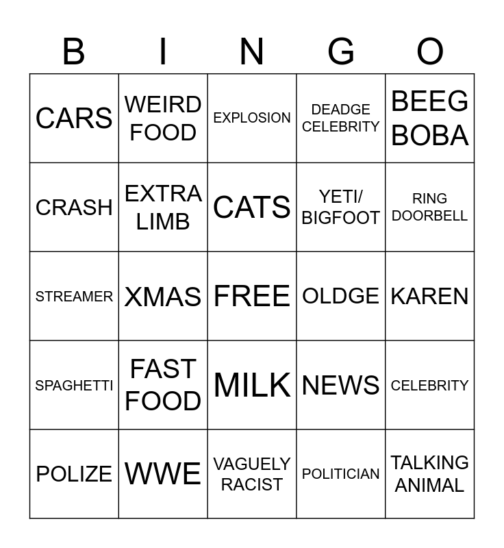 This bingo card has a free space and 24 words: FAST FOOD, WWE, CATS, POLIZE, BEEG BOBA, CARS, CRASH, WEIRD FOOD, OLDGE, MILK, YETI/ BIGFOOT, STREAMER, NEWS, CELEBRITY, EXTRA LIMB, POLITICIAN, KAREN, EXPLOSION, RING DOORBELL, XMAS, TALKING ANIMAL, SPAGHETTI, DEADGE CELEBRITY and VAGUELY RACIST.