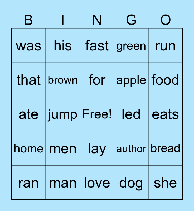 This bingo card has a free space and 24 words: men, man, for, ran, run, was, that, his, led, lay, apple, ate, author, bread, brown, dog, eats, fast, food, jump, she, home, green and love.