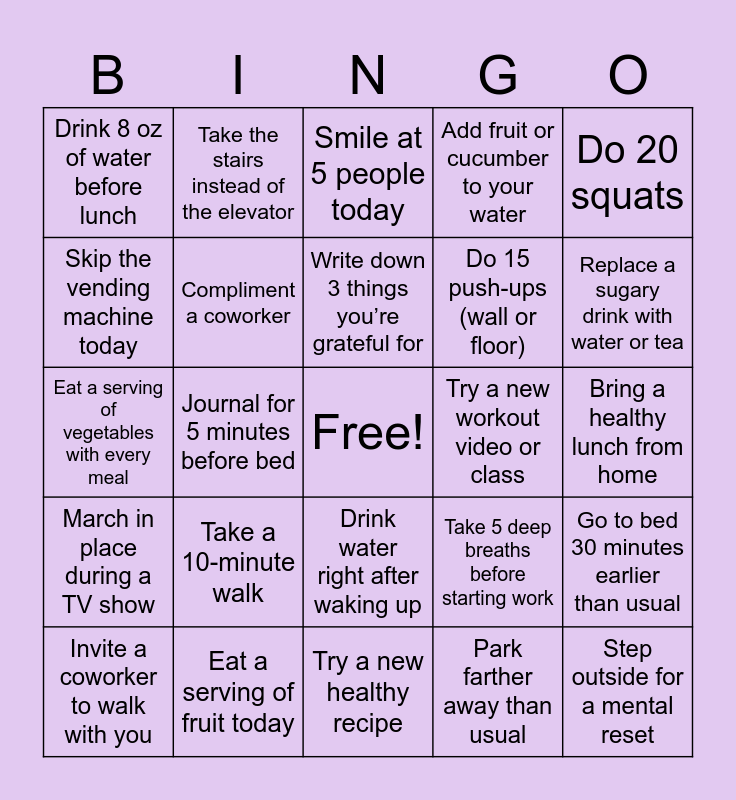 This bingo card has a free space and 24 words: Take a 10-minute walk, Eat a serving of fruit today, Write down 3 things you’re grateful for, Invite a coworker to walk with you, Do 20 squats, Drink 8 oz of water before lunch, Skip the vending machine today, Take the stairs instead of the elevator, Try a new workout video or class, Drink water right after waking up, Do 15 push-ups (wall or floor), Eat a serving of vegetables with every meal, Take 5 deep breaths before starting work, Go to bed 30 minutes earlier than usual, Compliment a coworker, Park farther away than usual, Bring a healthy lunch from home, Smile at 5 people today, Replace a sugary drink with water or tea, Journal for 5 minutes before bed, Step outside for a mental reset, March in place during a TV show, Add fruit or cucumber to your water and Try a new healthy recipe.