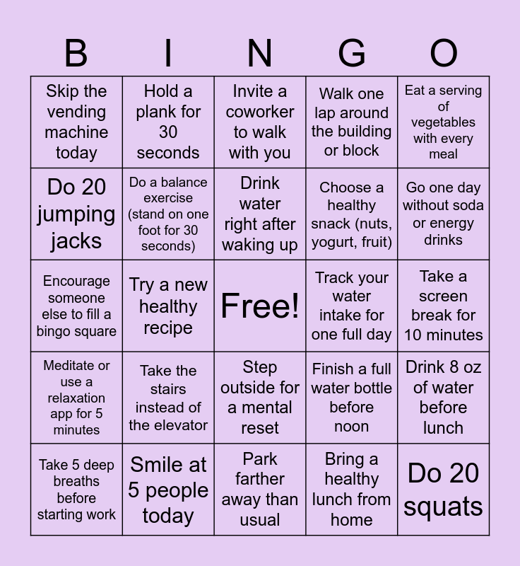 This bingo card has a free space and 48 words: Take a 10-minute walk, Do 20 squats, Stretch for 5 minutes, Park farther away than usual, Take the stairs instead of the elevator, Do 15 push-ups (wall or floor), Hold a plank for 30 seconds, Try a new workout video or class, Do 20 jumping jacks, March in place during a TV show, Do a balance exercise (stand on one foot for 30 seconds), Walk one lap around the building or block, Drink 8 oz of water before lunch, Finish a full water bottle before noon, Replace a sugary drink with water or tea, Add fruit or cucumber to your water, Drink water right after waking up, Track your water intake for one full day, Eat a serving of fruit today, Eat a serving of vegetables with every meal, Try a new healthy recipe, Bring a healthy lunch from home, Skip the vending machine today, Choose a healthy snack (nuts, yogurt, fruit), Read the nutrition label on a food item, Go one day without soda or energy drinks, Take 5 deep breaths before starting work, Write down 3 things you’re grateful for, Step outside for a mental reset, Meditate or use a relaxation app for 5 minutes, Compliment a coworker, Spend 10 minutes device-free, Listen to your favorite song, Stretch your neck and shoulders at your desk, Smile at 5 people today, Journal for 5 minutes before bed, Go to bed 30 minutes earlier than usual, Take a screen break for 10 minutes, Do gentle stretching before bed, Spend one evening without multitasking, Take a power nap (15–20 minutes), Unplug from electronics one hour before bed, Invite a coworker to walk with you, Share a healthy recipe with a friend, Encourage someone else to fill a bingo square, Attend a group fitness or wellness class, Give someone a genuine compliment and Celebrate a team member’s progress.
