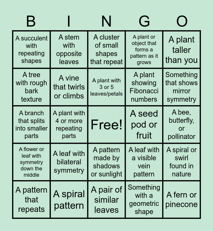 This bingo card has a free space and 24 words: A leaf with bilateral symmetry, A spiral pattern, A plant with 3 or 5 leaves/petals, A pattern that repeats, A plant taller than you, A succulent with repeating shapes, A tree with rough bark texture, A stem with opposite leaves, A seed pod or fruit, A pattern made by shadows or sunlight, A plant showing Fibonacci numbers, A branch that splits into smaller parts, A leaf with a visible vein pattern, A spiral or swirl found in nature, A vine that twirls or climbs, Something with a geometric shape, A bee, butterfly, or pollinator, A cluster of small shapes that repeat, Something that shows mirror symmetry, A plant with 4 or more repeating parts, A fern or pinecone, A flower or leaf with symmetry down the middle, A plant or object that forms a pattern as it grows and A pair of similar leaves.