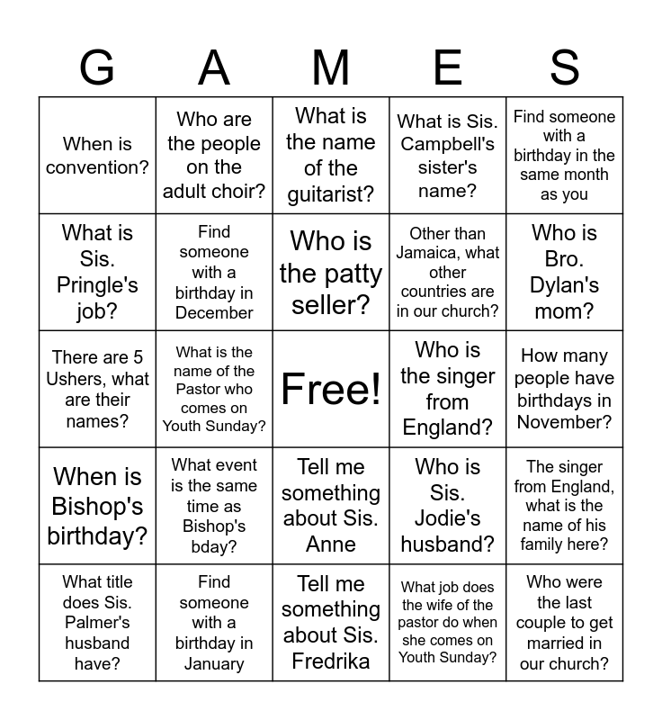 This bingo card has a free space and 29 words: Find someone from Barbados, Find someone with a birthday in January, What is the name of the guitarist?, What are the names of the Praise & Worship team?, Find someone with a birthday in the same month as you, When is convention?, Find someone with a birthday in December, Who is the patty seller?, Who is the singer from England?, The singer from England, what is the name of his family here?, What title does Sis. Palmer's husband have?, What is the name of the Pastor who comes on Youth Sunday?, What job does the wife of the pastor do when she comes on Youth Sunday?, Who were the last couple to get married in our church?, There are 5 Ushers, what are their names?, What is the first name initial of Bishop's wife?, Tell me something about Sis. Fredrika, Who is Sis. Jodie's husband?, Who is Bro. Dylan's mom?, When is Bishop's birthday?, What event is the same time as Bishop's bday?, Tell me something about Sis. Barbara, Other than Jamaica, what other countries are in our church?, How many people have birthdays in November?, What is Sis. Pringle's job?, Who are the people on the adult choir?, Tell me something about Sis. Anne, What is Sis. Campbell's sister's name? and Who is Bro. Andrew's wife?.