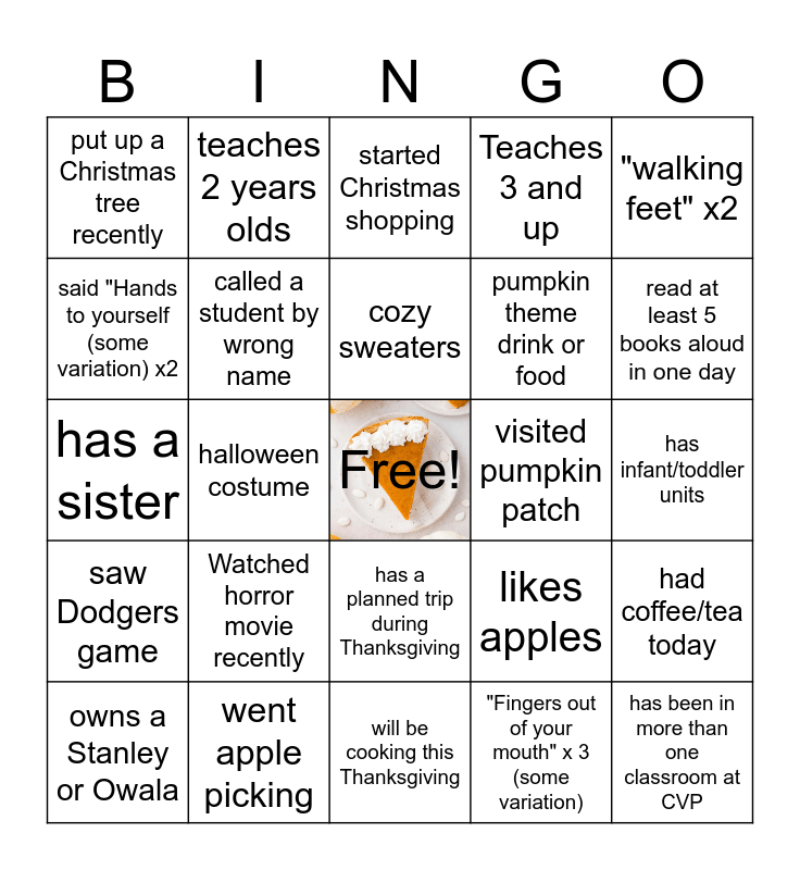 This bingo card has a free space and 25 words: Watched horror movie recently, will be cooking this Thanksgiving, cozy sweaters, owns a Stanley or Owala, "walking feet" x2, put up a Christmas tree recently, said "Hands to yourself (some variation) x2, teaches 2 years olds, visited pumpkin patch, has a planned trip during Thanksgiving, pumpkin theme drink or food, has a sister, likes apples, had coffee/tea today, called a student by wrong name, has done icebreakers before, has infant/toddler units, started Christmas shopping, read at least 5 books aloud in one day, halloween costume, has been in more than one classroom at CVP, went apple picking, saw Dodgers game, Teaches 3 and up and "Fingers out of your mouth" x 3 (some variation).