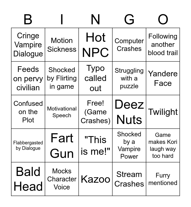 This bingo card has a free space and 24 words: Fart Gun, Mocks Character Voice, Typo called out, Bald Head, Following another blood trail, Cringe Vampire Dialogue, Feeds on pervy civilian, Motion Sickness, Deez Nuts, "This is me!", Struggling with a puzzle, Confused on the Plot, Shocked by a Vampire Power, Game makes Kori laugh way too hard, Shocked by Flirting in game, Stream Crashes, Twilight, Hot NPC, Yandere Face, Motivational Speech, Furry mentioned, Flabbergasted by Dialogue, Computer Crashes and Kazoo.