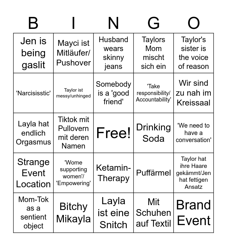 This bingo card has a free space and 24 words: 'Wome supporting women'/ 'Empowering', Bitchy Mikayla, Somebody is a 'good friend', Mom-Tok as a sentient object, Taylor's sister is the voice of reason, Jen is being gaslit, 'Narcisisstic', Mayci ist Mitläufer/ Pushover, Drinking Soda, Ketamin-Therapy, 'Take responsibility/ Accountability', Layla hat endlich Orgasmus, Puffärmel, Taylor hat ihre Haare gekämmt/Jen hat fettigen Ansatz, Taylor ist messy/unhinged, Mit Schuhen auf Textil, 'We need to have a conversation', Husband wears skinny jeans, Wir sind zu nah im Kreissaal, Tiktok mit Pullovern mit deren Namen, Brand Event, Strange Event Location, Taylors Mom mischt sich ein and Layla ist eine Snitch.