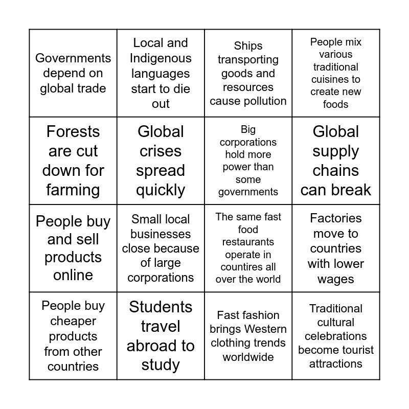 This bingo card has 20 words: Factories move to countries with lower wages, People watch the same movies worldwide, Ships transporting goods and resources cause pollution, Countries make agreements to fight climate change, People buy cheaper products from other countries, Forests are cut down for farming, Students travel abroad to study, Governments depend on global trade, People buy and sell products online, Local and Indigenous languages start to die out, Small local businesses close because of large corporations, The same fast food restaurants operate in countires all over the world, Global crises spread quickly, Traditional cultural celebrations become tourist attractions, Big corporations hold more power than some governments, Poorer countries rely on exporting natural resources, Global supply chains can break, People mix various traditional cuisines to create new foods, Fast fashion brings Western clothing trends worldwide and People feel a loss of national identity.