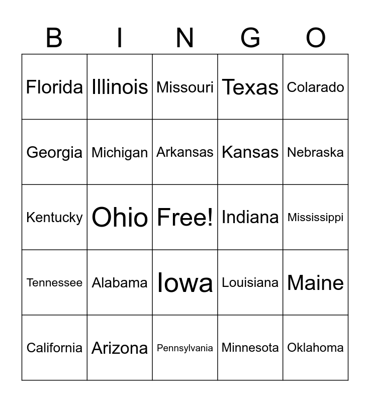 This bingo card has a free space and 24 words: Alabama, Arizona, Arkansas, California, Colarado, Florida, Georgia, Illinois, Indiana, Iowa, Kansas, Kentucky, Louisiana, Maine, Michigan, Minnesota, Mississippi, Missouri, Nebraska, Ohio, Oklahoma, Tennessee, Texas and Pennsylvania.