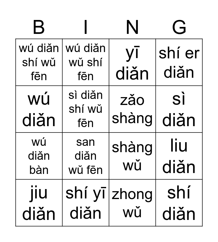 Time | Time & Daily Routine | Unit 1 Bingo | Time | Chinese Corner: Numbers