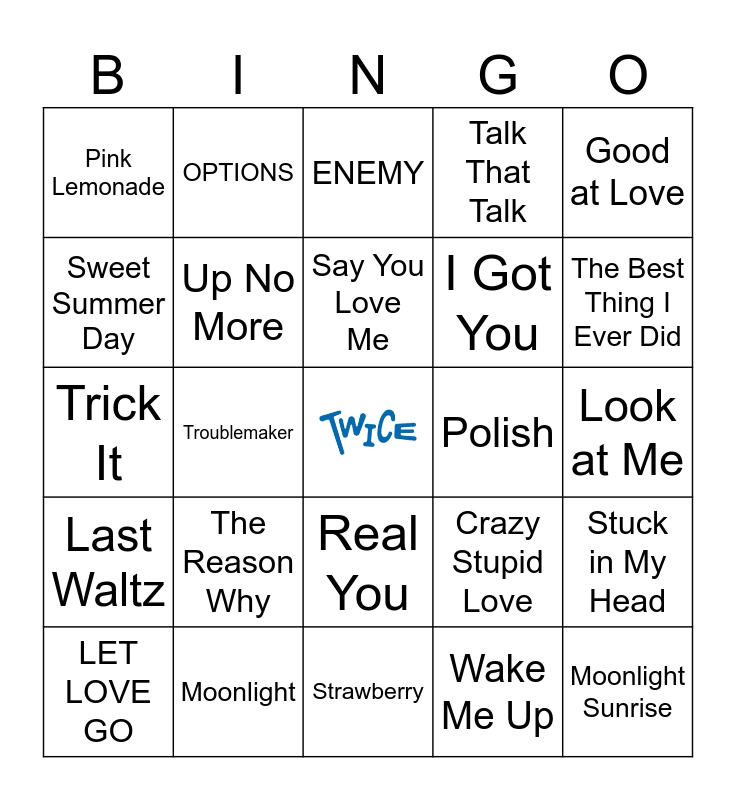 This bingo card has a free space and 40 words: Closer, Trick It, Shot Thru the Heart, Up No More, Moonlight, Real You, Say You Love Me, That’s All I’m Saying, Good at Love, Last Waltz, Troublemaker, Talk That Talk, Moonlight Sunrise, Look at Me, Polish, The Reason Why, When We Were Kids, Pink Lemonade, Believer, ENEMY, Stuck in My Head, Wake Me Up, I Got You, Sweet Summer Day, Ponytail, Celebrate, Better, Breakthrough, Rewind You, ABCD, Room, LET LOVE GO, No Problem, Crazy Stupid Love, The Best Thing I Ever Did, Strawberry, Do It Again, One More Time, OPTIONS and Feel Special.