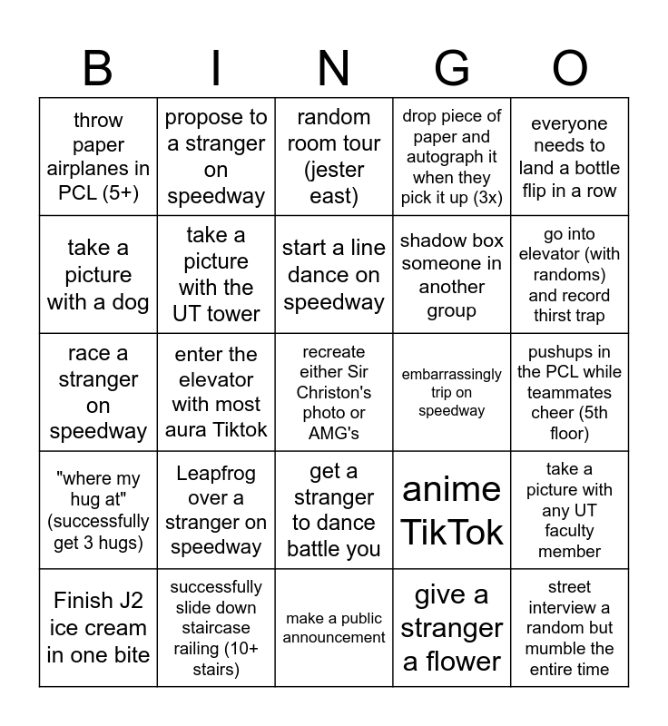 This bingo card has a free space and 24 words: Leapfrog over a stranger on speedway, successfully slide down staircase railing (10+ stairs), start a line dance on speedway, Finish J2 ice cream in one bite, everyone needs to land a bottle flip in a row, throw paper airplanes in PCL (5+), take a picture with a dog, propose to a stranger on speedway, embarrassingly trip on speedway, get a stranger to dance battle you, shadow box someone in another group, race a stranger on speedway, anime TikTok, take a picture with any UT faculty member, take a picture with the UT tower, give a stranger a flower, pushups in the PCL while teammates cheer (5th floor), random room tour (jester east), go into elevator (with randoms) and record thirst trap, enter the elevator with most aura Tiktok, street interview a random but mumble the entire time, "where my hug at" (successfully get 3 hugs), drop piece of paper and autograph it when they pick it up (3x) and make a public announcement.