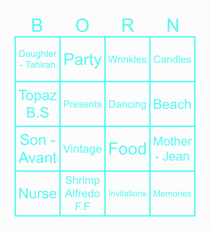 This bingo card has 50 words: Married, Nurse, November 8 th, Bingo Queen, Family, Friend's, Party, Birthday Cake, Presents, Games, Dancing, Candles, Flintstone ERA, Experienced, Action Suspense, Romantic Comedy, Beach, Shrimp Alfredo F.F, Orange F.C, Topaz B.S, Mother - Jean, Father - Beresford, Daughter - Tahirah, Son - Avant, Memory Loss, Naps, Vintage, Seasoned, Wrinkles, Over the Hill, Nifty at 50, Hard of Hearing, Carbon - Dated, Balloon's, Cards, Celebration, Ice Cream, Party Favors, Ribbons, Invitations, Happy Birthday, Fun, Chocolate, Shindig, Birthday Girl, Food, Laughter, Birthday Dress, Memories and Hangover's.