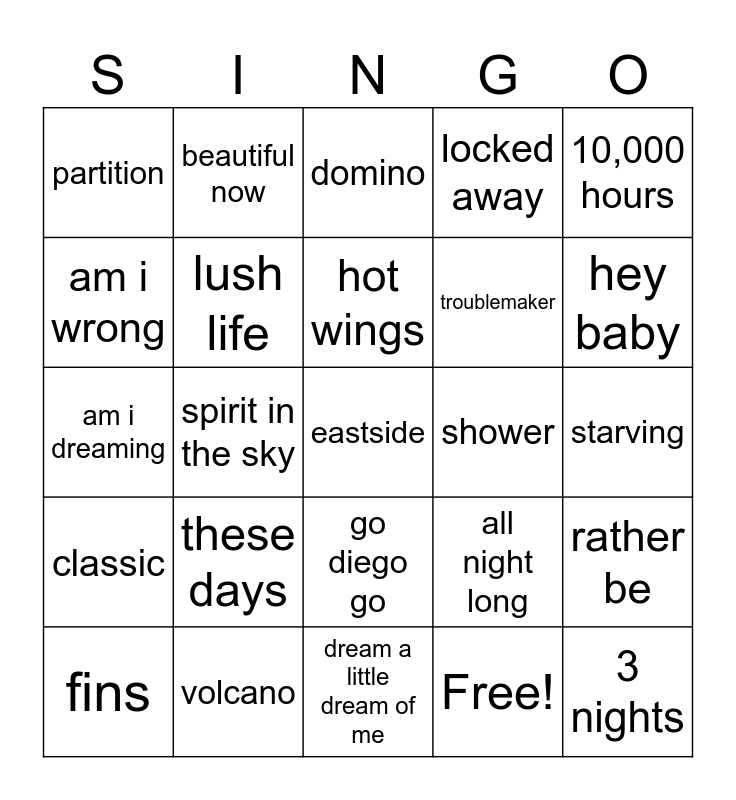 This bingo card has 30 words: volcano, young, wild & free, spirit in the sky, start a fire, partition, domino, lush life, go diego go, shower, dream a little dream of me, starving, eastside, Free!, 3 nights, hey baby, black magic, all night long, classic, these days, 10,000 hours, am i dreaming, misery, beautiful now, troublemaker, am i wrong, locked away, rather be, fins, hot wings and scream & shout.