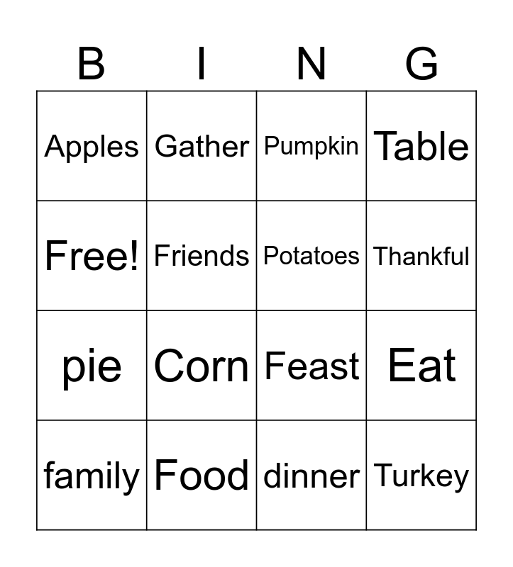 This bingo card has 16 words: Food, Eat, Pumpkin, Apples, pie, Gather, Feast, dinner, Free!, Friends, family, Table, Corn, Thankful, Potatoes and Turkey.