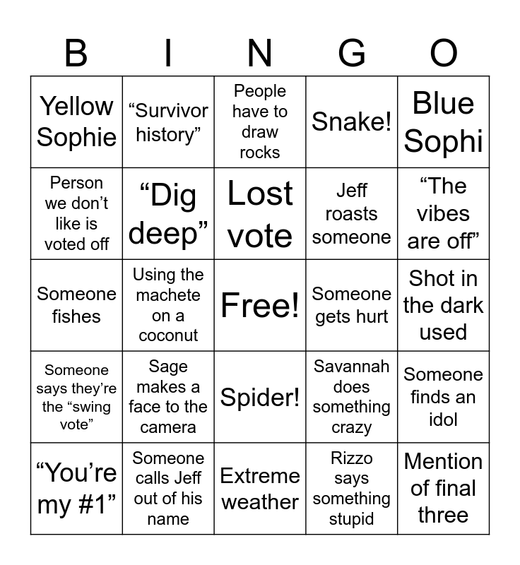 This bingo card has a free space and 24 words: Sage makes a face to the camera, Someone calls Jeff out of his name, Lost vote, “You’re my #1”, Blue Sophi, Yellow Sophie, Person we don’t like is voted off, “Survivor history”, Someone gets hurt, Spider!, Jeff roasts someone, Someone fishes, Savannah does something crazy, Someone finds an idol, “Dig deep”, Rizzo says something stupid, Shot in the dark used, People have to draw rocks, “The vibes are off”, Using the machete on a coconut, Mention of final three, Someone says they’re the “swing vote”, Snake! and Extreme weather.