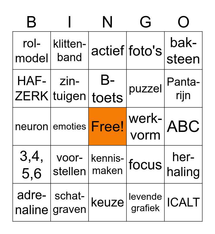This bingo card has a free space and 24 words: voor-stellen, schat-graven, B-toets, adre-naline, bak-steen, rol-model, HAF-ZERK, klitten-band, werk-vorm, kennis-maken, puzzel, neuron, focus, her-haling, zin-tuigen, levende grafiek, ABC, actief, Panta-rijn, emoties, ICALT, 3,4, 5,6, foto's and keuze.
