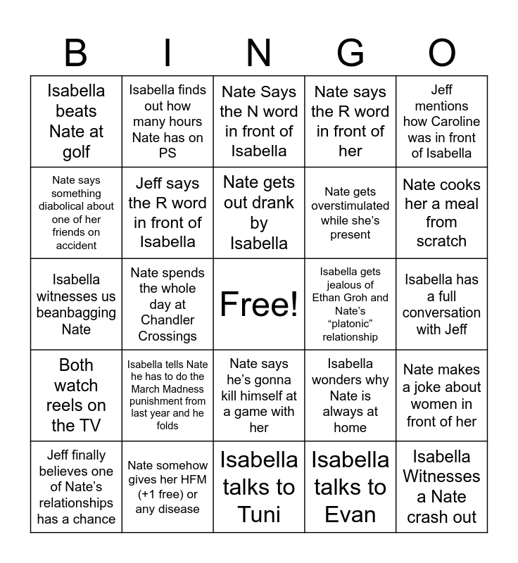This bingo card has a free space and 24 words: Isabella tells Nate he has to do the March Madness punishment from last year and he folds, Nate somehow gives her HFM (+1 free) or any disease, Nate gets out drank by Isabella, Jeff finally believes one of Nate’s relationships has a chance, Jeff mentions how Caroline was in front of Isabella, Isabella beats Nate at golf, Nate says something diabolical about one of her friends on accident, Isabella finds out how many hours Nate has on PS, Isabella gets jealous of Ethan Groh and Nate’s “platonic” relationship, Nate says he’s gonna kill himself at a game with her, Nate gets overstimulated while she’s present, Isabella witnesses us beanbagging Nate, Isabella wonders why Nate is always at home, Nate makes a joke about women in front of her, Jeff says the R word in front of Isabella, Isabella talks to Evan, Isabella has a full conversation with Jeff, Nate Says the N word in front of Isabella, Nate cooks her a meal from scratch, Nate spends the whole day at Chandler Crossings, Isabella Witnesses a Nate crash out, Both watch reels on the TV, Nate says the R word in front of her and Isabella talks to Tuni.
