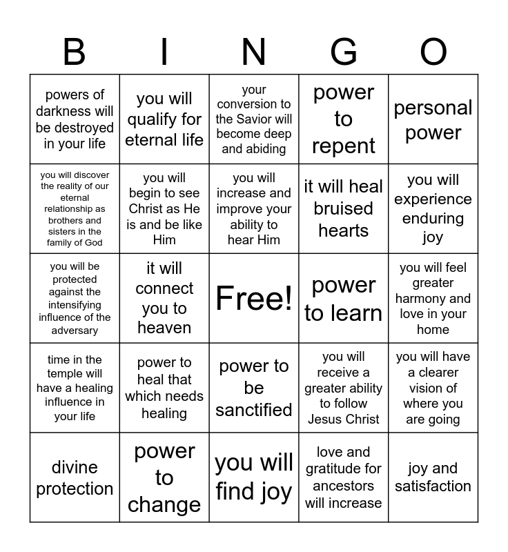 This bingo card has a free space and 44 words: it will have a refining influence on you, joy and satisfaction, more closeness and joy in your family, divine protection, your heart will turn to your fathers, love and gratitude for ancestors will increase, your conversion to the Savior will become deep and abiding, protection from temptation and ills of this world, personal power, power to change, power to repent, power to learn, power to be sanctified, power to heal that which needs healing, you will receive a more certain witness that life continues beyond the veil, you will find joy, you will be blessed in every other aspect of your life, you will be protected against the intensifying influence of the adversary, you will be safeguarded in your youth and throughout your lives, you will experience enduring joy, you will qualify for eternal life, your heart will be purified, heavenly channels will be opened thru which power of godliness can flow into your life, powers of darkness will be destroyed in your life, time in temple will change your life, you will feel greater harmony and love in your home, you will feel a deeper desire to care for your eternal relationships, receive increased faith in the Lord Jesus Christ, you will receive a greater ability to follow Jesus Christ, time in the temple will have a healing influence in your life, you will feel an assurance that you are precious in God’s eyes, you will have a clearer vision of where you are going, you will receive strength and direction for your own life, it will fortify your home, it will connect you to heaven, gives you an eternal perspective, ministering angels will become a vital part of the fortification of your home, you will be safeguarded, guided and protected, you will increase and improve your ability to hear Him, you will discover the reality of our eternal relationship as brothers and sisters in the family of God, it will heal bruised hearts, can unify strained relationships, you will begin to see Christ as He is and be like Him and you will discover who you are and how extraordinary you can be.