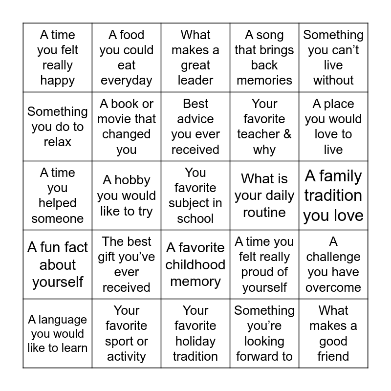 This bingo card has 25 words: The best gift you’ve ever received, Your favorite holiday tradition, Best advice you ever received, A language you would like to learn, Something you can’t live without, A time you felt really happy, Something you do to relax, A food you could eat everyday, What is your daily routine, A favorite childhood memory, Your favorite teacher & why, A time you helped someone, A time you felt really proud of yourself, A challenge you have overcome, A book or movie that changed you, What makes a good friend, A family tradition you love, What makes a great leader, A place you would love to live, A hobby you would like to try, You favorite subject in school, Your favorite sport or activity, A fun fact about yourself, A song that brings back memories and Something you’re looking forward to.