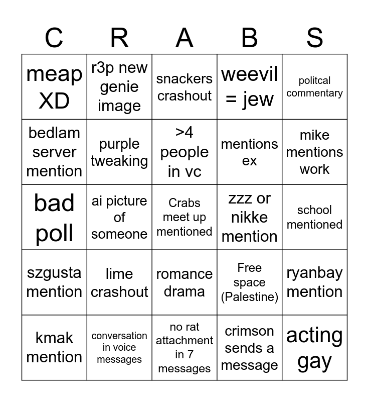 This bingo card has 25 words: lime crashout, no rat attachment in 7 messages, >4 people in vc, kmak mention, politcal commentary, meap XD, bedlam server mention, r3p new genie image, zzz or nikke mention, romance drama, mentions ex, bad poll, Free space (Palestine), ryanbay mention, purple tweaking, acting gay, school mentioned, snackers crashout, mike mentions work, ai picture of someone, Crabs meet up mentioned, conversation in voice messages, szgusta mention, weevil = jew and crimson sends a message.