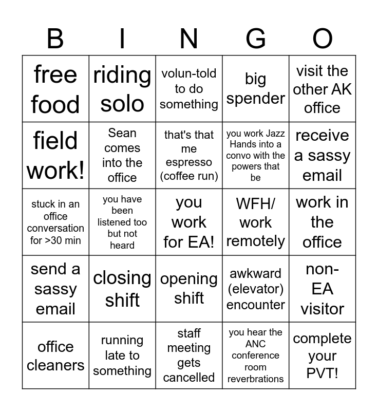 This bingo card has a free space and 24 words: closing shift, running late to something, that's that me espresso (coffee run), office cleaners, visit the other AK office, free food, field work!, riding solo, WFH/ work remotely, opening shift, you work Jazz Hands into a convo with the powers that be, stuck in an office conversation for >30 min, awkward (elevator) encounter, non- EA visitor, Sean comes into the office, you hear the ANC conference room reverbrations, work in the office, volun-told to do something, receive a sassy email, you have been listened too but not heard, complete your PVT!, send a sassy email, big spender and staff meeting gets cancelled.