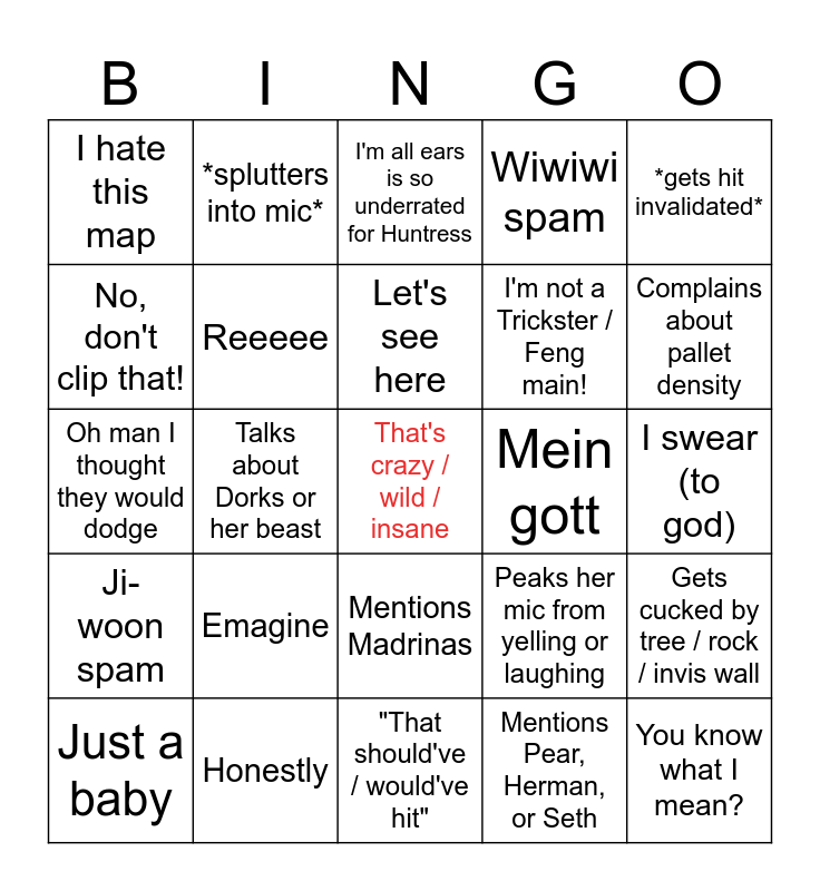 This bingo card has a free space and 24 words: Emagine, Honestly, Let's see here, Just a baby, *gets hit invalidated*, I hate this map, No, don't clip that!, *splutters into mic*, Mein gott, Mentions Madrinas, I'm not a Trickster / Feng main!, Oh man I thought they would dodge, Peaks her mic from yelling or laughing, Gets cucked by tree / rock / invis wall, Reeeee, Mentions Pear, Herman, or Seth, I swear (to god), I'm all ears is so underrated for Huntress, Complains about pallet density, Talks about Dorks or her beast, You know what I mean?, Ji-woon spam, Wiwiwi spam and "That should've / would've hit".