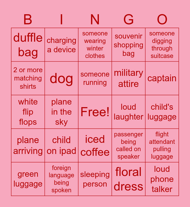 This bingo card has a free space and 24 words: child on ipad, foreign language being spoken, someone running, green luggage, someone digging through suitcase, duffle bag, 2 or more matching shirts, charging a device, loud laughter, iced coffee, military attire, white flip flops, passenger being called on speaker, flight attendant pulling luggage, dog, floral dress, child's luggage, someone wearing winter clothes, captain, plane in the sky, loud phone talker, plane arriving, souvenir shopping bag and sleeping person.