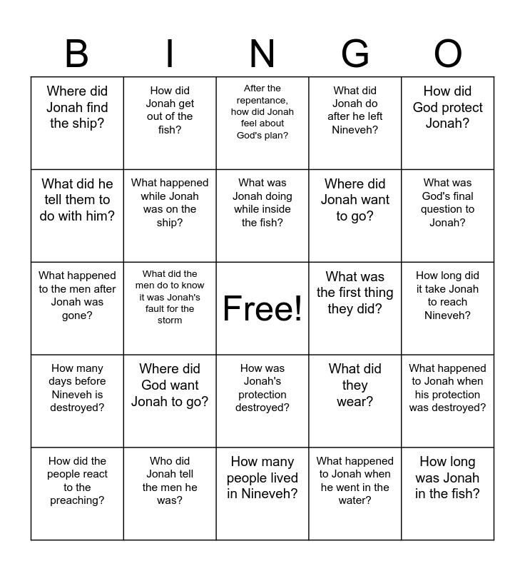 This bingo card has a free space and 24 words: Where did God want Jonah to go?, Who did Jonah tell the men he was?, What was Jonah doing while inside the fish?, How did the people react to the preaching?, How did God protect Jonah?, Where did Jonah find the ship?, What did he tell them to do with him?, How did Jonah get out of the fish?, What was the first thing they did?, How was Jonah's protection destroyed?, Where did Jonah want to go?, What happened to the men after Jonah was gone?, What did they wear?, What happened to Jonah when his protection was destroyed?, What happened while Jonah was on the ship?, What happened to Jonah when he went in the water?, How long did it take Jonah to reach Nineveh?, After the repentance, how did Jonah feel about God's plan?, What was God's final question to Jonah?, What did the men do to know it was Jonah's fault for the storm, How long was Jonah in the fish?, How many days before Nineveh is destroyed?, What did Jonah do after he left Nineveh? and How many people lived in Nineveh?.
