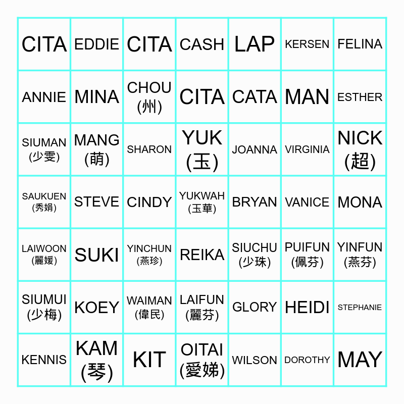 This bingo card has 49 words: HEIDI, MAN, WILSON, STEVE, SHARON, MONA, EDDIE, KIT, KERSEN, REIKA, FELINA, CASH, VIRGINIA, JOANNA, KOEY, VANICE, ANNIE, ESTHER, STEPHANIE, LAP, CATA, CINDY, CITA, MINA, KENNIS, CHOU (州), NICK (超), KAM (琴), YUK (玉), MANG (萌), MAY, BRYAN, SIUMUI (少梅), WAIMAN (偉民), SAUKUEN (秀娟), SIUCHU (少珠), PUIFUN (佩芬), YINFUN (燕芬), SIUMAN (少雯), YINCHUN (燕珍), LAIFUN (麗芬), LAIWOON (麗媛), YUKWAH (玉華), OITAI (愛娣), CITA, CITA, GLORY, SUKI and DOROTHY.