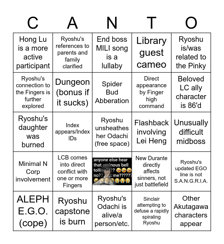 This bingo card has 1 images, a free space and 23 words: LCB comes into direct conflict with one or more Fingers, Ryoshu capstone is burn, Spider Bud Abberation, ALEPH E.G.O. (cope), Ryoshu is/was related to the Pinky, Hong Lu is a more active participant, Ryoshu's connection to the Fingers is further explored, Ryoshu's references to parents and family clarified, Flashback involving Lei Heng, Direct appearance by Finger high command, Ryoshu's daughter was burned, New Durante directly affects sinners, not just battlefield, Ryoshu's updated EGO line is not S.A.N.G.R.I.A., Dungeon (bonus if it sucks), Sinclair attempting to defuse a rapidly spiraling Ryoshu, Unusually difficult midboss, End boss MILI song is a lullaby, Beloved LC ally character is 86'd, Index appears/Index IDs, Other Akutagawa characters appear, Minimal N Corp involvement, Library guest cameo and Ryoshu's Odachi is alive/a person/etc..